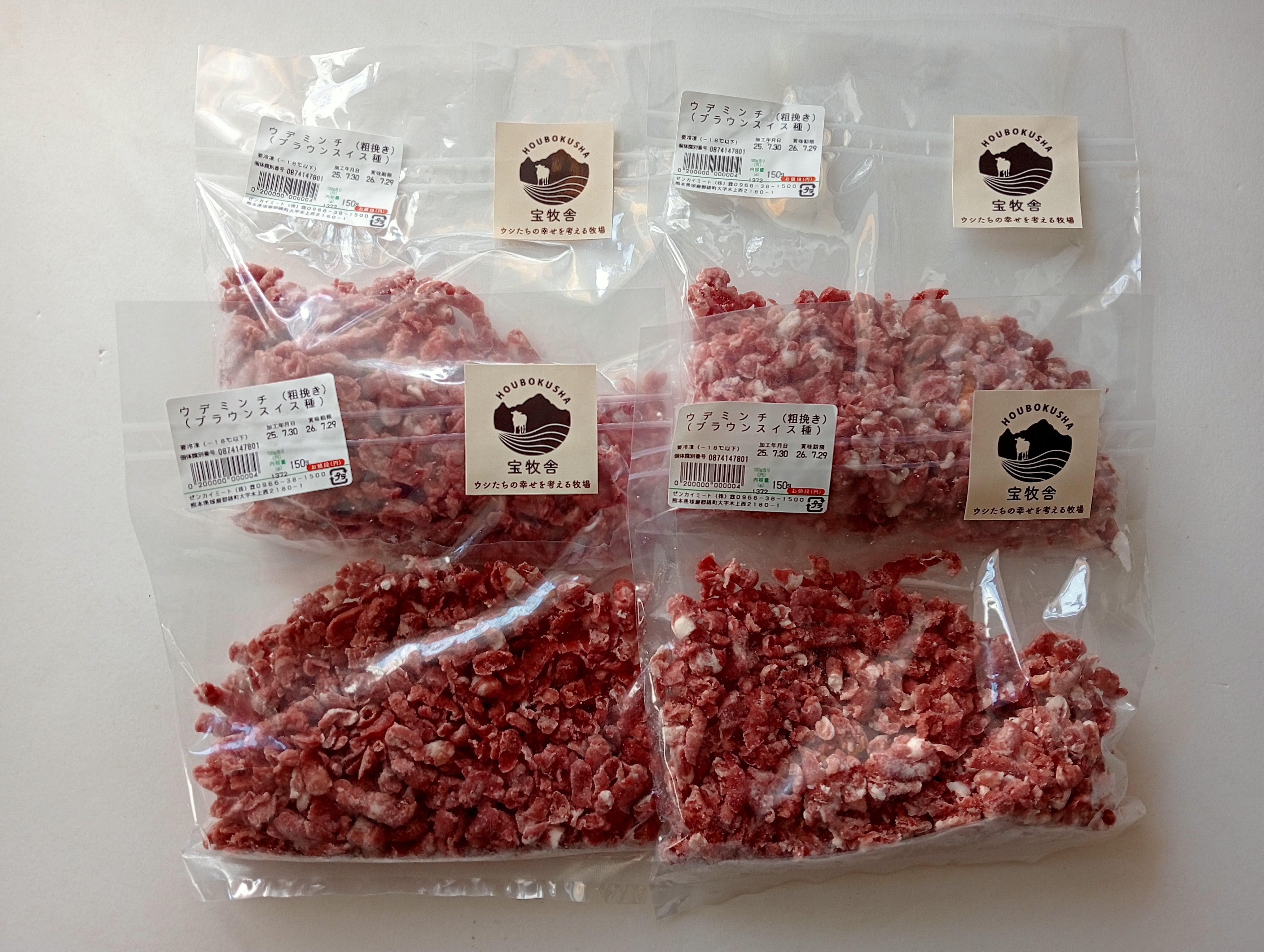 一般的なミンチは、ブロック肉をステーキやスライス肉などにカットした際に出る、端材のお肉などから作られる事が多いですが、宝牧舎のミンチはブロック肉そのものをミンチにしております。